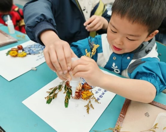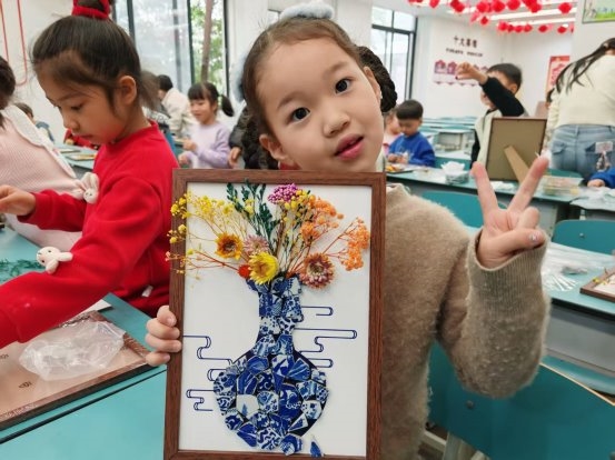 活动由社区居民自组织牵头统筹策划、金牛区培力社会服务中心指导,全程践行“居民自治、多元参与”理念,以非遗青花瓷文化为核心载体,自组织成员为孩子们讲解青花瓷历史渊源、拼贴技法与美学表达,指导孩子们通过瓷片拼贴、干花点缀等形式完成创意作品,在动手实践中感受传统工艺魅力,提升文化自信与审美素养。